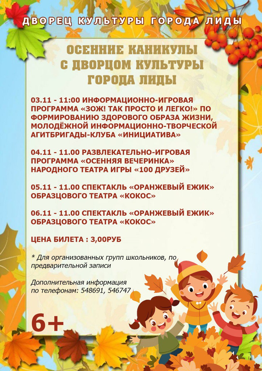Осенние каникулы во Дворце культуры города Лиды — время ярких впечатлений и событий! 🍁🍁🍁🍁🍁🍁🍁🍁🍁 Присоединяйтесь к нам — вместе создадим атмосферу тепла, творчества и веселья! Мы подготовили для вас интересные мероприятия❗️ ✅03.11 в 11:00 – информационно-игровая программа "ЗОЖ! ТАК ПРОСТО И ЛЕГКО!" ✅04.11 в 11:00 – развлекательно- игровая программа "ОСЕННЯЯ ВЕЧЕРИНКА" ✅05.11 в 11:00 - спектакль "ОРАНЖЕВЫЙ ЕЖИК" ✅06.11 в 11:00 - спектакль "ОРАНЖЕВЫЙ ЕЖИК" Цена билета: 3,00 рубля 📞Предварительная запись по телефонам: 546747; 548691 Не упустите шанс провести эти каникулы активно и интересно!