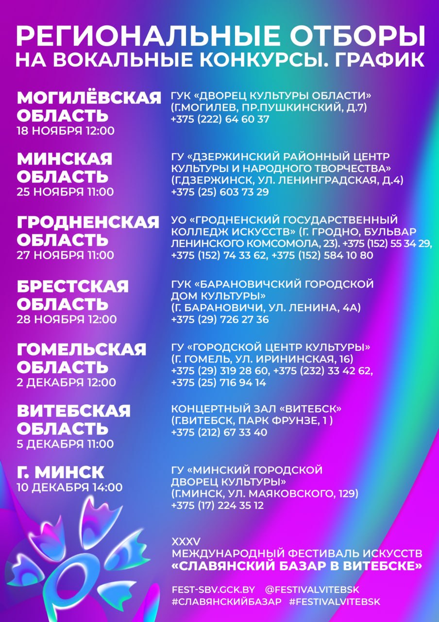 🌀СТАРТ РЕГИОНАЛЬНЫХ ОТБОРОВ К КОНКУРСАМ «СЛАВЯНСКОГО БАЗАРА В ВИТЕБСКЕ» УЖЕ 18 НОЯБРЯ! Международный фестиваль искусств «СЛАВЯНСКИЙ БАЗАР В ВИТЕБСКЕ» 18 ноября начнёт региональные отборы на детский музыкальный конкурс и конкурс исполнителей эстрадной песни. Марафон прослушиваний стартует в городе Могилеве. Далее экспертное жюри отправится в Дзержинск. Голоса Минской области будут слушать 25 ноября. Гродно примет отборочный тур 27 ноября. Бресткая область откроет слушания 28 ноября. Её областной кастинг пройдёт в Барановичах. Гомельская область покажет свои таланты 2 декабря. Столица фестиваля примет вокалистов 5 декабря, а завершится первый этап национального отбора традиционно в столице Беларуси. Исполнителей из Минска ждут на прослушивание 10 декабря. Витебск ждёт талантливых участников, имеющих гражданство РБ: - детей в возрасте от 8 до 14 лет включительно, - взрослых от 18 до 31 года включительно. Опыт концертных выступлений будет несомненным преимуществом. От каждой области и г. Минска выберут не более 5-ти человек. Для участия в отборочном туре необходимо представить по 2 композиции: - участникам конкурса исполнителей эстрадной песни: эстрадную песню композитора славянской страны на одном из славянских языков (не более трех минут); популярную композицию на иностранном языке («мировой хит») - участникам детского музыкального конкурса: эстрадную песню композитора славянской страны на одном из славянских языков (не более трех минут); эстрадную песню детско-юношеской тематики (не более трех минут). Представленные на детский музыкальный конкурс песни должны соответствовать детско-юношеской тематике, быть созвучны возрасту и миропониманию участника. 🌀ФОРМУ заявки на участие можно скачать по ссылке: https://disk.yandex.by/i/UHGzviFOQ10jrQВведите текст заголовка