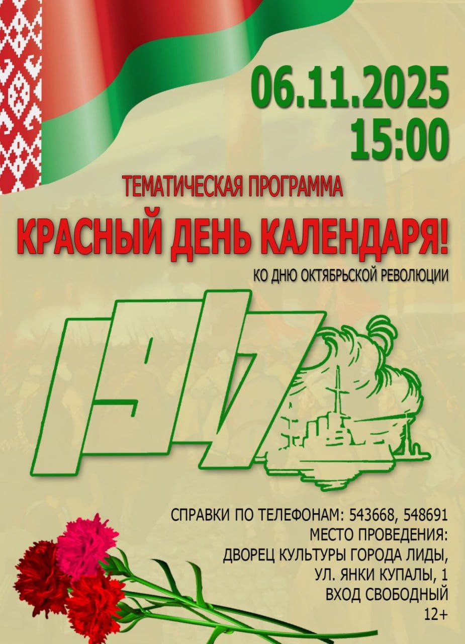 Приглашаем вас на тематическую программу "Красный день календаря!", посвященную Дню Октябрьской революции! 🗓 Дата: 6 ноября 2025 года ⏰ Время: 15:00 🏛 Место проведения: Дворец культуры города Лиды, ул. Янки Купалы, 1 Вход свободный! Возрастное ограничение: 12+ 📞 Справки по телефонам: 543668, 548691 Приходите окунуться в атмосферу исторических событий и творчества!