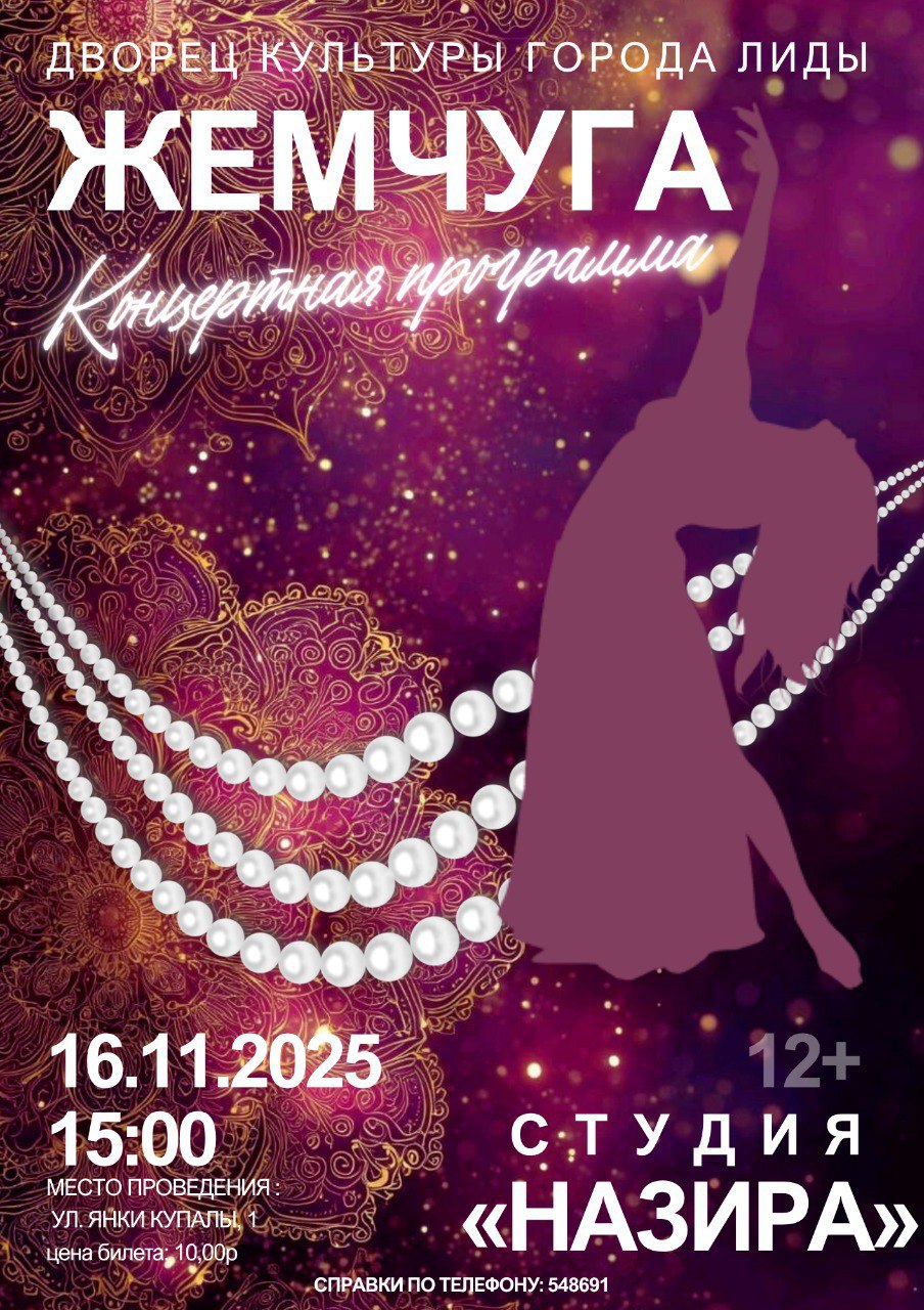 ✨16 ноября во Дворце культуры города Лиды вас ждет концертная программа "Жемчуга" от студии "Назира". ✨ Волшебство танца, яркие костюмы и завораживающая музыка перенесут вас в атмосферу восточной сказки, красоты и творчества. 📅 Дата: 16 ноября 2025 🕒 Время: 15:00 📍 Место: Дворец культуры, ул. Янки Купалы, 1 💰 Цена билета: 10,00 руб. 📱 Справки по телефону: 548691 Возрастное ограничение: 12+ Не пропустите это яркое событие! 💫
